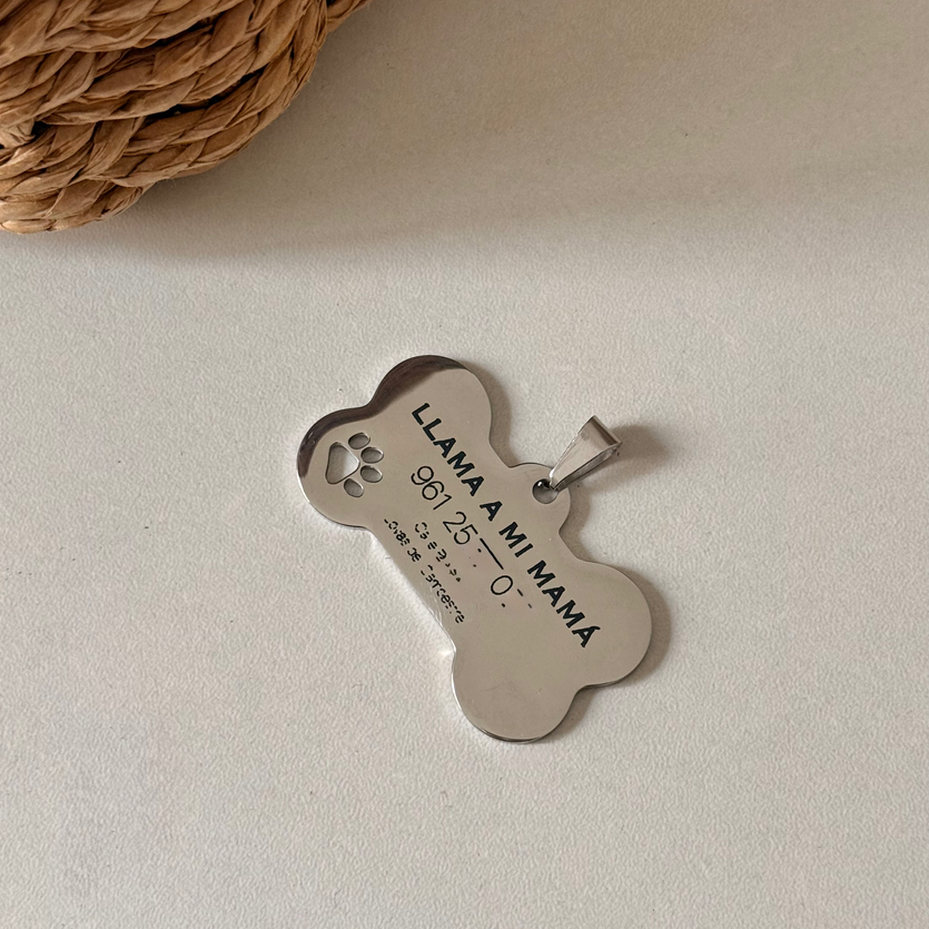Esta plaquita en forma de hueso no solo lleva su nombre: lleva el amor, los paseos compartidos, las siestas a tu lado, los días buenos y los difíciles… todo lo que construyen juntos.